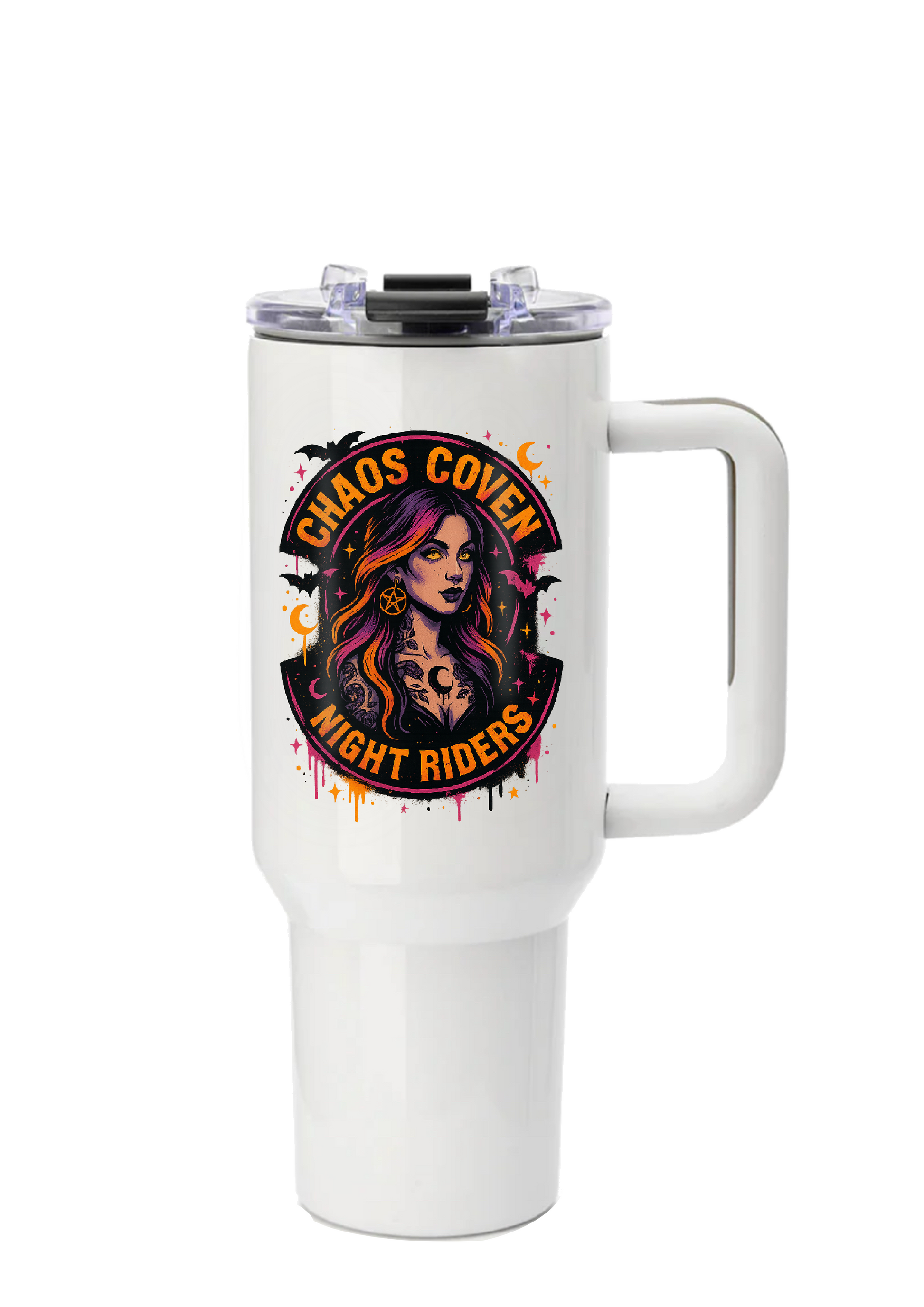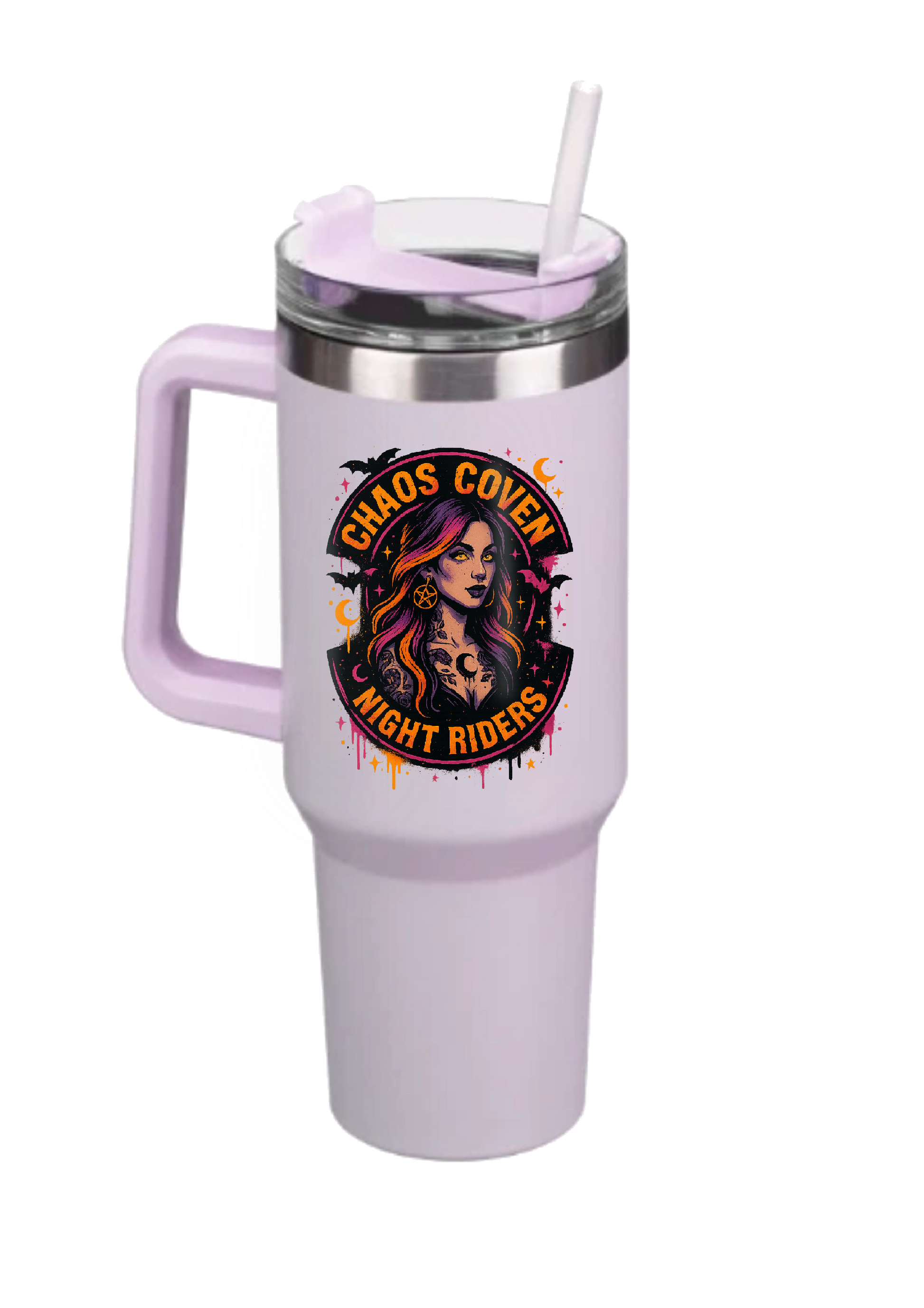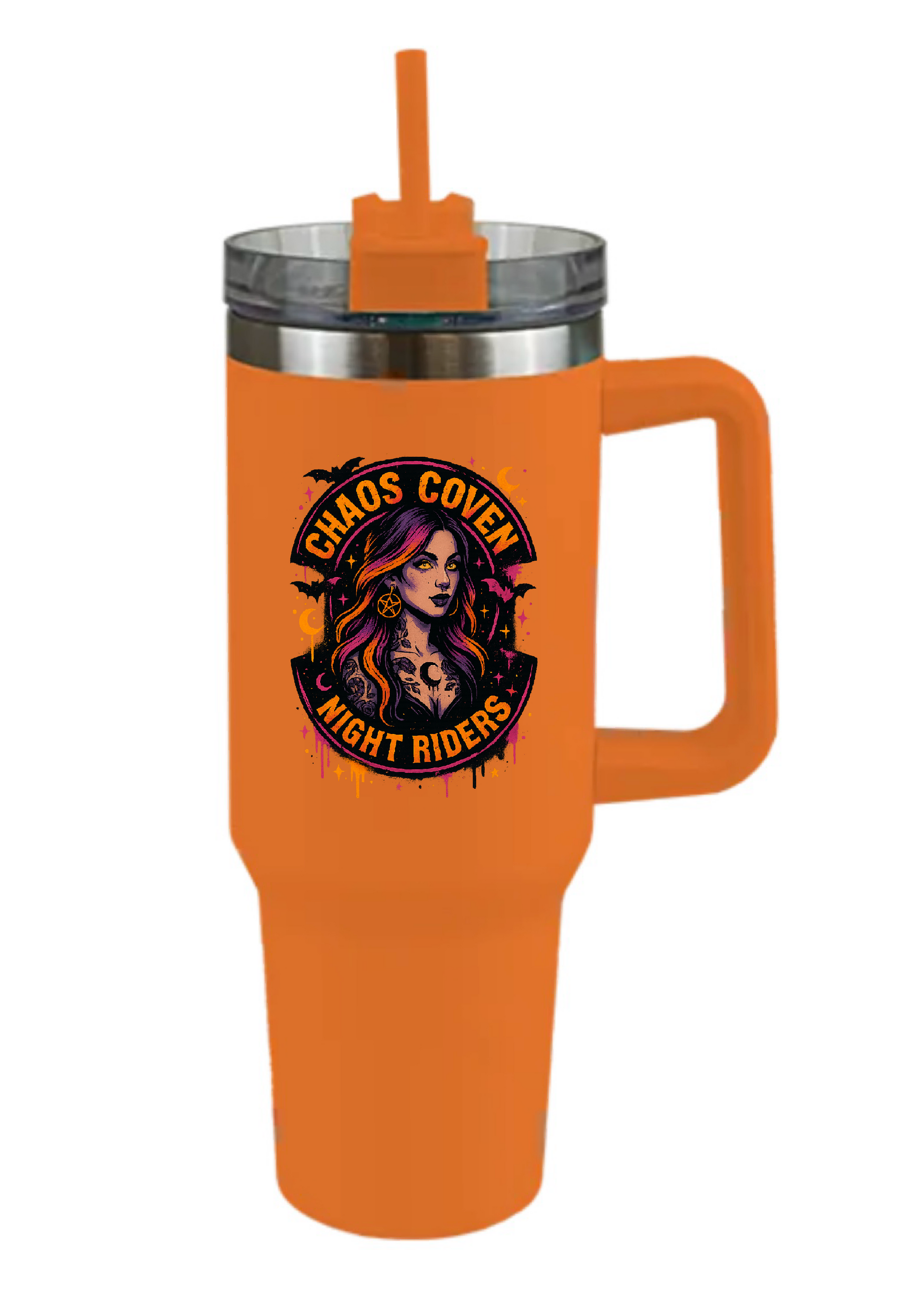 40oz Tumbler – Chaos Coven Night Riders – Double Walled Stainless Steel with Handle & Straw – Gothic Witchy Mug – Halloween Alt Gift for Coffee Lovers
