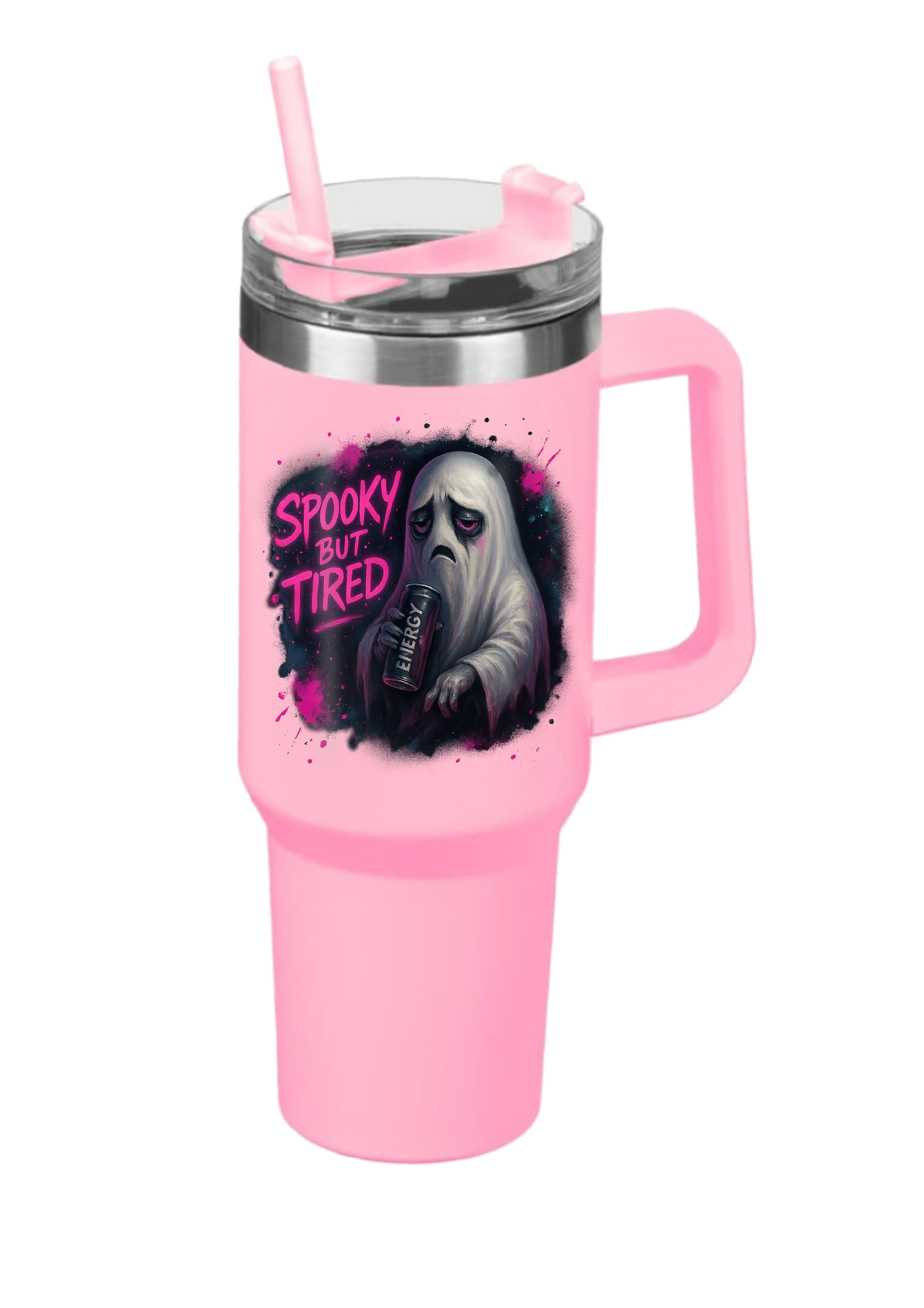 For the chronically exhausted but still delightfully spooky. This 40oz double-walled stainless steel tumbler features the “Spooky But Tired” design — a sad little ghost clutching its energy drink and a sense of doom. It’s the perfect Halloween vibe for anyone who’s overworked, under-caffeinated, and too tired to haunt properly.