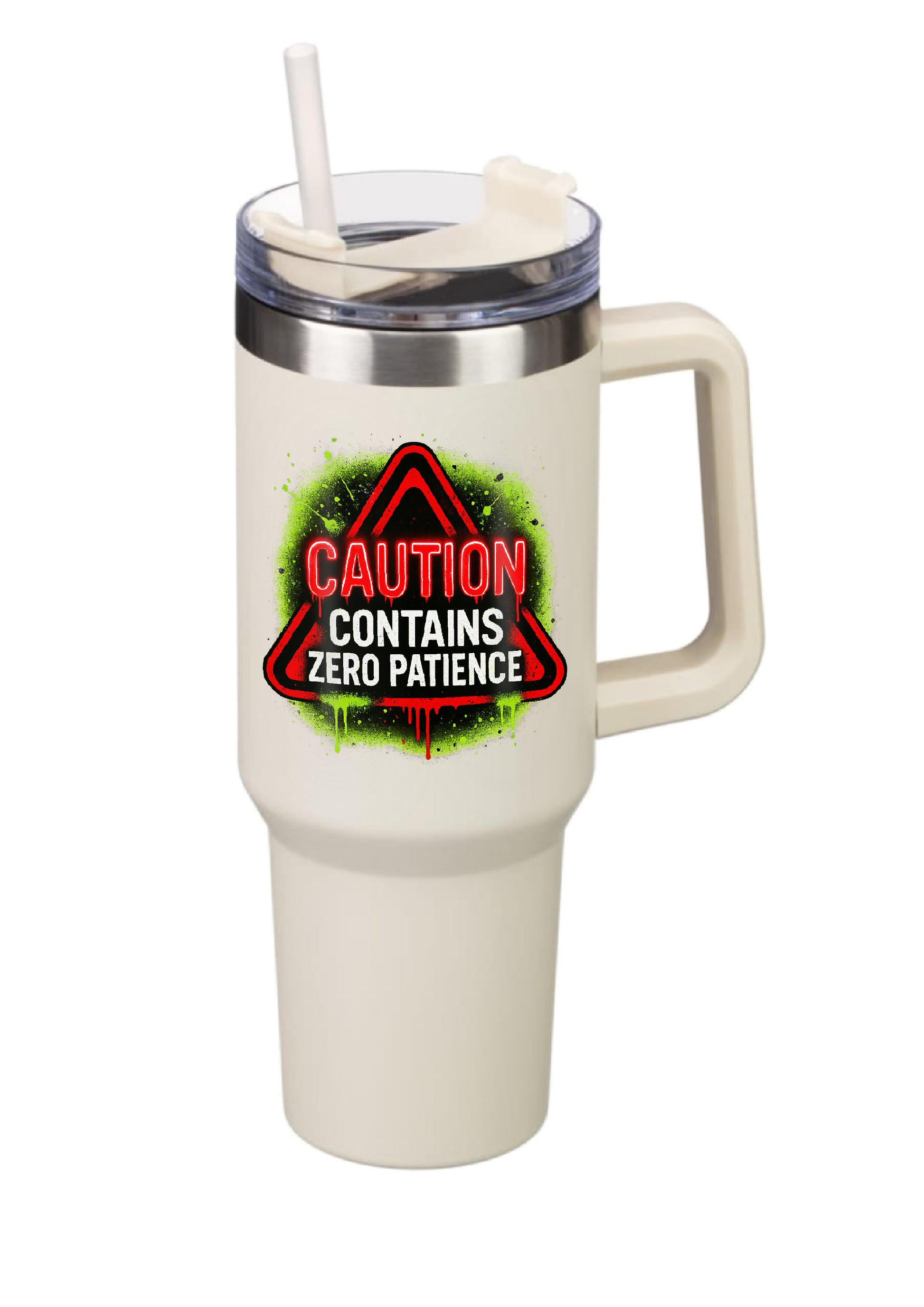 Warning: may contain sarcasm, caffeine, and absolutely zero patience. This 40oz double-walled stainless steel tumbler is built for those who run on attitude instead of energy drinks. The bold “Caution: Contains Zero Patience” design pops with neon green spray paint vibes and red warning text — perfect for anyone who’s not here for small talk before their first sip.