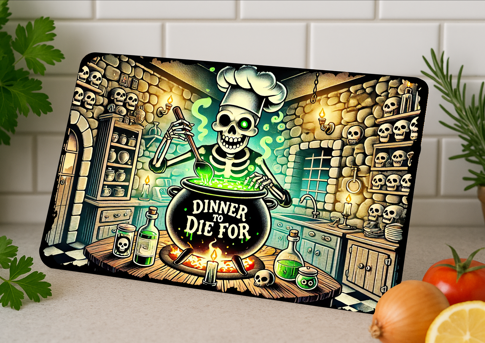 Glass Chopping Board-Skeleton Chef “Dinner to Die For” | Gothic Halloween Kitchen Décor