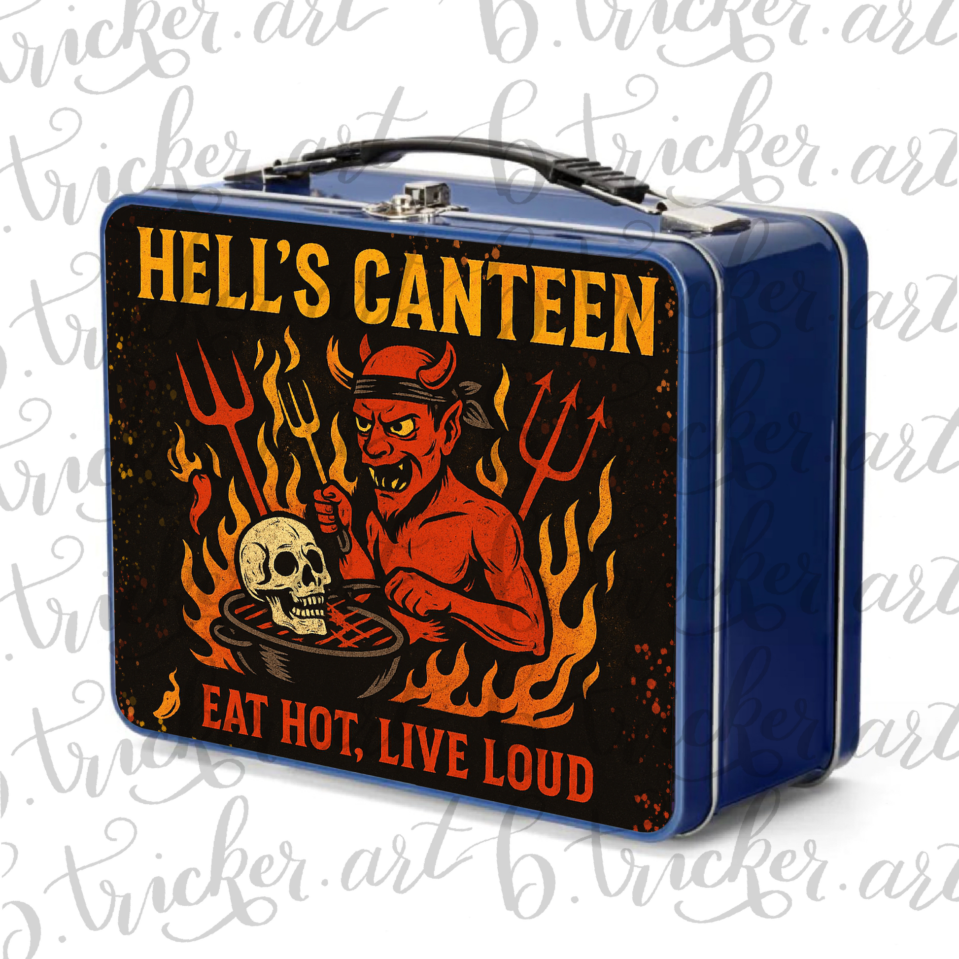 Hell’s Canteen Metal Lunchbox – Devil BBQ Gothic Punk Lunch Box – Eat Hot, Live Loud – Red, Blue, Silver Options – Alt Lunch Carrier