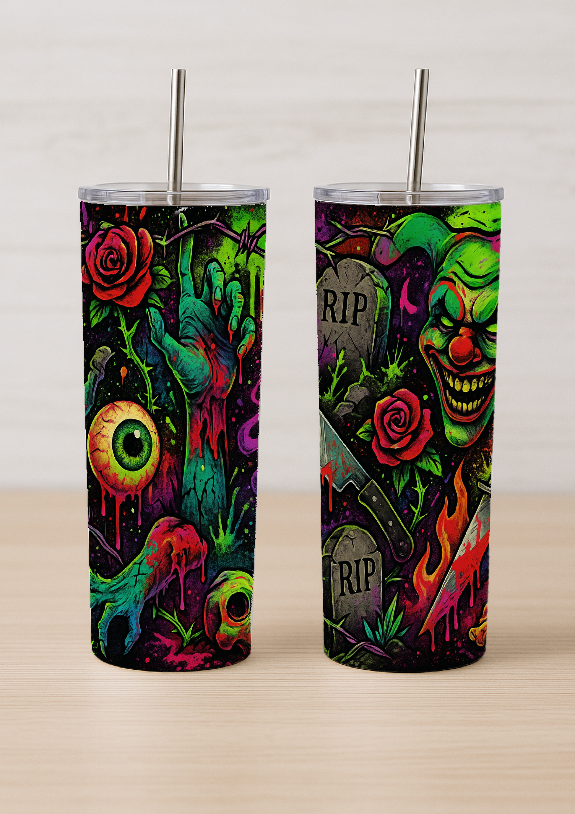Horror 20oz Tumbler – Zombie Hand & Killer Clown | Neon Graveyard Design