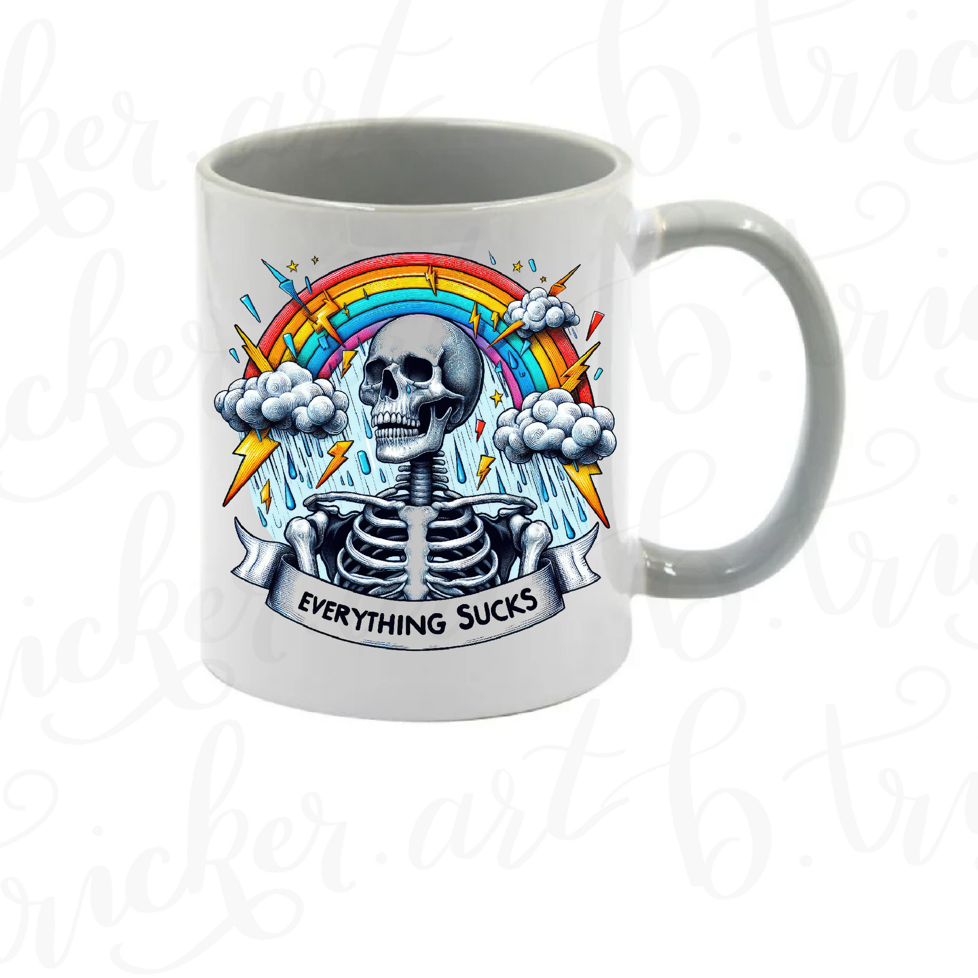 Sarcastic Gothic Mug | “Everything Sucks” Skeleton & Rainbow 11oz Coffee Cup | Alternative Funny Gift